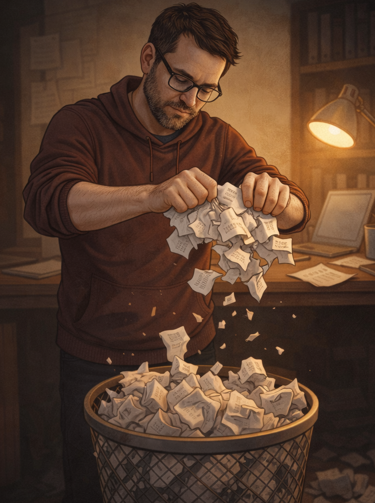 I back up, erase the existence of the past 20 minutes of plot, and repave their journey. I’m not afraid to crumple up my writing and throw it away. I have yet to write a single indispensable series of words. Maybe that day will come, and maybe I won’t be able to dispose of what I have just written, but if that ever happens I’ll just have to figure out what that third options is… take what I love, and navigate the treacherous terrain to make those words make contextual sense.
